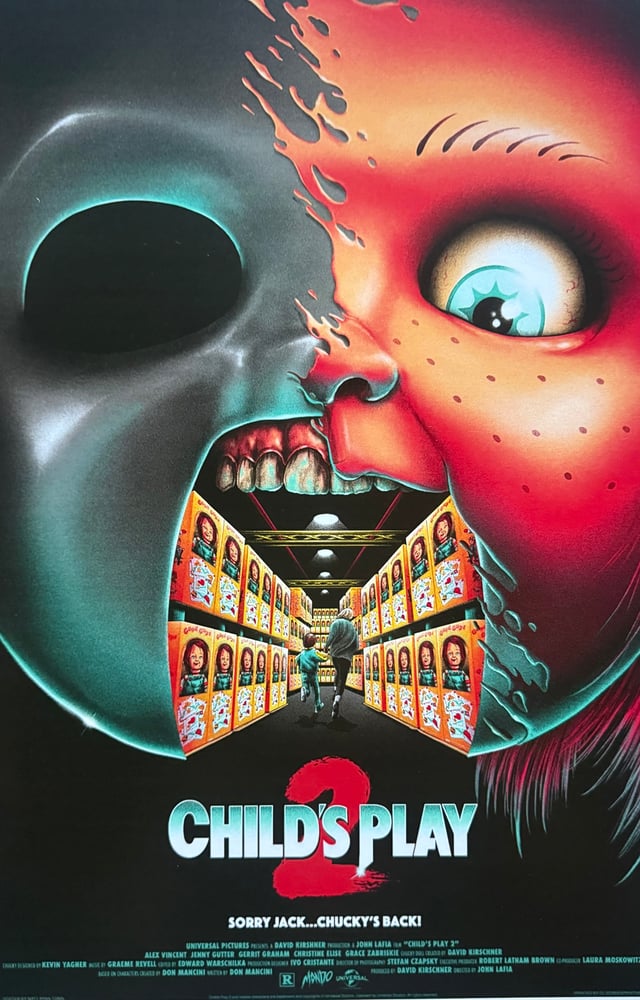 One of the most iconic images from Child’s Play 2, this Good Guys warehouse poster captures the film’s legendary factory finale, featuring ANDY and KYLE. The split-face design and endless rows of boxed dolls reflect the sequel’s darker humor and mass-produced nightmare, where Chucky becomes both singular threat and unstoppable product. This 17×11 print is a longtime fan favorite and a must-have for collectors who know the warehouse is where CP2 truly cemented its legacy.