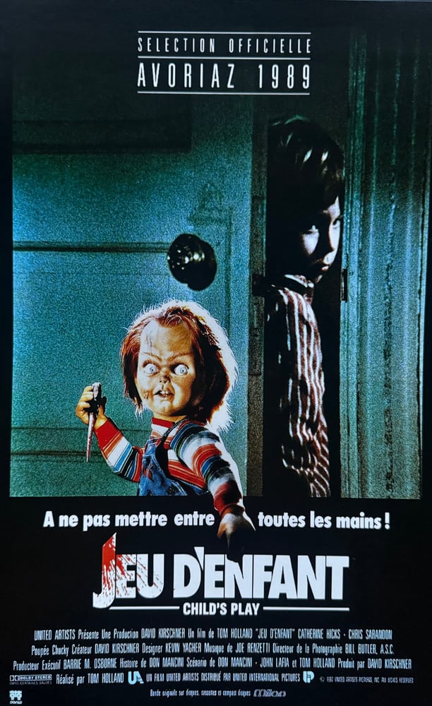 This 17×11 piece zeroes in on the ending of the original Child’s Play—the moment after the damage is done, when the truth has finally landed. Chucky is exposed, knife still in hand, no disguise left, while Andy watches from the doorway knowing this isn’t over. Not by a long shot. That look says it all—fear mixed with the understanding that what he’s seen can’t be undone. The French Jeu d’Enfant poster treatment adds an extra layer of cold distance, but the tension is universal. This is the last beat of the film where innocence is gone, the threat is real, and the door closing doesn’t mean safety. It just means the nightmare has learned where you live.