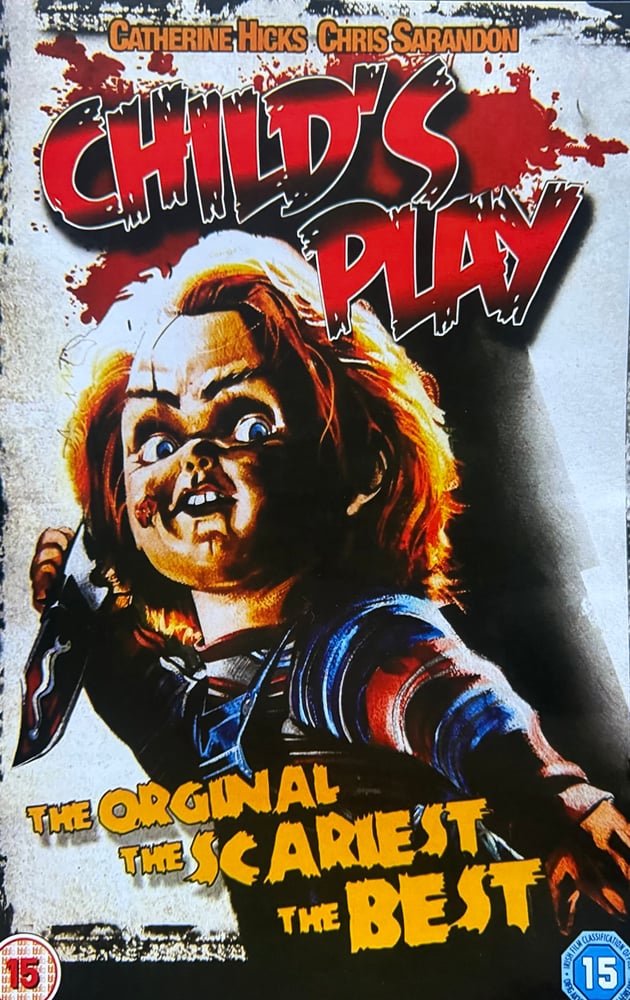 This 17×11 feels like an international Child’s Play cover you’d stumble on in a video shop and never forget. The colors are harsher, the blood pops harder, and Chucky looks more feral than playful—pure B-horror energy. The tagline hits like a challenge: The original. The scariest. The best. This version isn’t polished or subtle; it’s loud, aggressive, and meant to grab you fast. It captures that era when horror marketing didn’t worry about restraint—just impact. If you’re into alternate covers and overseas artwork that pushes the character further into grindhouse territory, this one sits right in that lane.