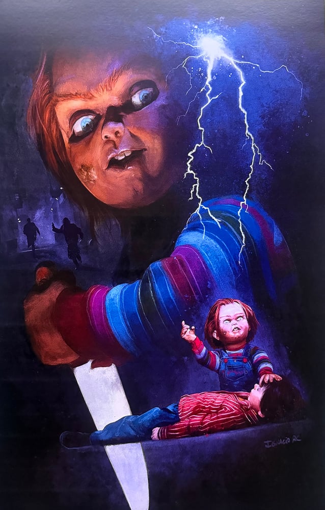This 17×11 brings it back to the moment everything was stolen from Andy. Chucky towers over the frame like a storm, lightning cutting through the night as the violence finally spills out into the open. Andy is right there in the shot—not hidden, not symbolic—watching the nightmare he tried to warn everyone about take shape in front of him. This image captures the cruel imbalance at the heart of Child’s Play: a child forced to witness something no one believes, while the thing responsible enjoys the chaos. It’s loud, brutal, and tragic all at once—the night Andy loses more than his innocence, and Chucky proves he was never just a toy.
